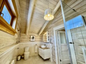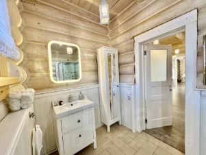 ТЕХНОЛОГИЧНЫЙ КОМФОРТ. Все продумано: теплые водяные полы, два санузла с душем и подогревом полов, огромная выделенная мощность (40 кВт), умная система отопления от электрокотла (управляется со смартфона!) или пеллетного котла. Котельная расположена в бане, к дому идет поземная утепленная теплотрасса. Водоснабжение из колодца, система очистки воды (расходный материал таблетированная соль) и две локальные очистные станции (расходный материал не требуется) - для дома и бани.