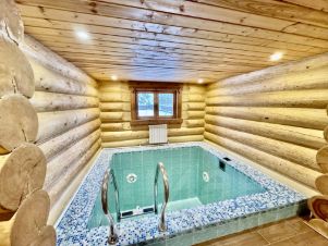 БАНЯ с БАССЕЙНОМ: Отдельная бревенчатая баня (48 м²) с большой парной, комнатой отдыха, туалетом и, внимание, собственным бассейном глубиной 3 метра! Купаться можно и зимой, и летом. В отдельных помещениях бани — котельная и водоподготовка.