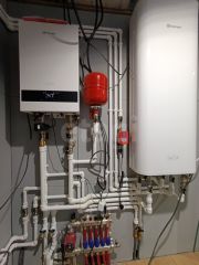 Отопление: электрический котел Термекс 12 кВт, управление по Wifi. Теплоноситель пропиленгликоль. Комнаты - радиаторы; гостиная, прихожая, санузел - теплые полы в бетонной стяжке.