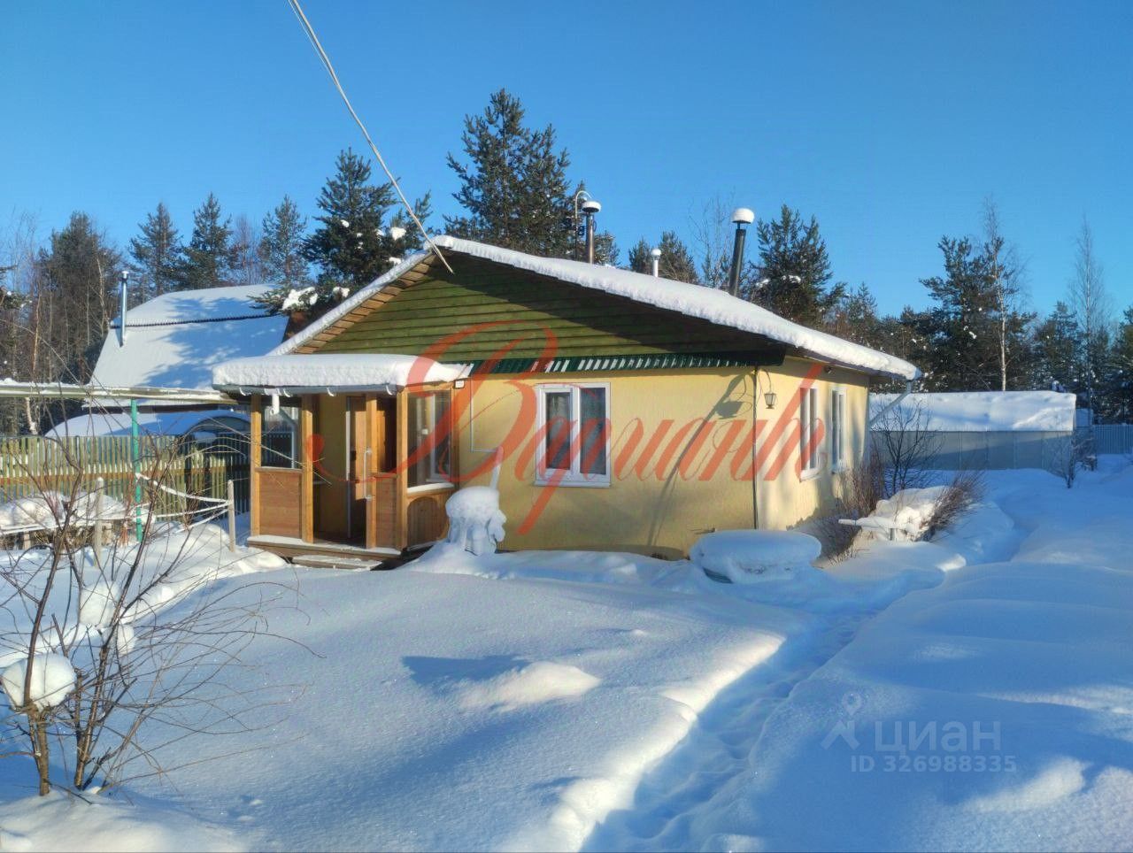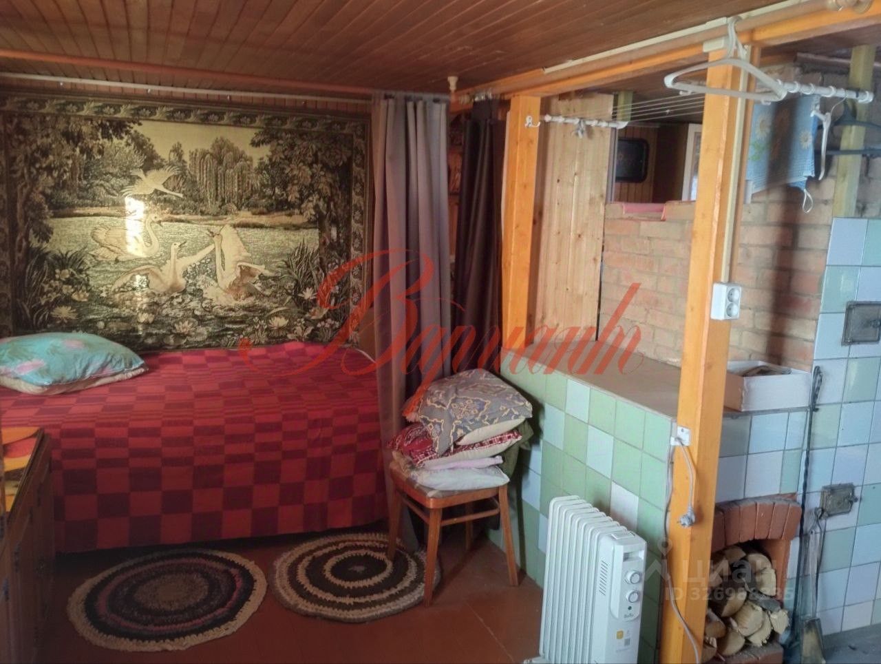 Установлен на ленточном фундаменте, обшит вагонкой внутри, печное отопление.