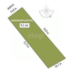 Земельный участок площадью 8,2 сотки, ровной прямоугольной формы. Земли населенных пунктов, подходит для строительства жилого дома. На границе участка стоит столб с электричеством.