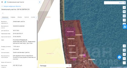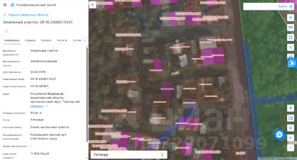Земельный участок с кадастровым номером - 29:03:031201:274. Местоположение - Российская Федерация, Архангельская область, Вилегодский район, д. Мухонская. Площадь 5 000 кв. м. Категория земель - Земли населенных пунктов. Вид р...