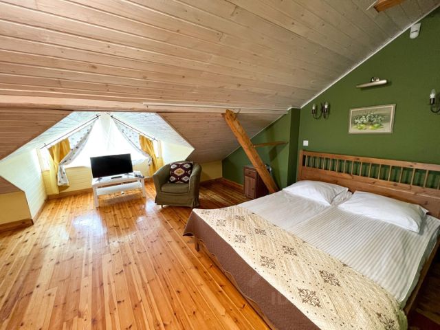 Просторный однокомнатный номер с двуспальной кроватью, отдельной мини-кухней в деревянном гостевом доме. Важно: цветовая гамма номера может отличаться от заявленного на фото! Завтрак: включен (с 08:00 до 11:00). Жилая площадь: 55 м2. Расположение: Гостевой дом 1, 2. Вместимость: 2 основных места (+2 доп.места за отдельную плату на раскладном диване). Спальные места: двуспальная кровать, диван (доп.место). Мини кухня: чайник, холодильник, микроволновая печь, бутылка с помпой. Набор посуды: салатники, тарелки, чашки, стаканы, чайные ложки, столовые ложки, вилки, нож, графин, чайные пакетики, пакетики сахара - на 4 персоны. Набор предметов гостеприимства: зубной набор, шапочка для душа, тапочки, беруши. Ванная комната: душ, пол с подогревом, туалет, фен