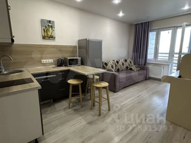 Квартира студия в новом доме. Все как на фотографиях, после ремонта, мебель и техника все новенькое,(стиральная машина, диван, кухня, прихожая, холодильник, микроволновка) балкон застеклен, утеплен.